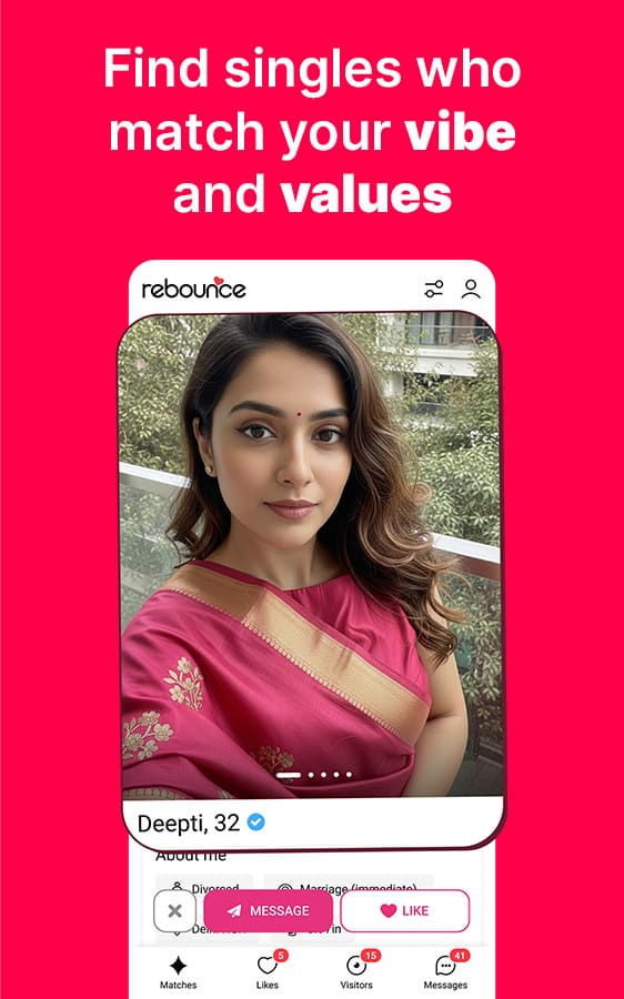 Rebounce is a dedicated matchmaking and matrimonial app for divorcees, separated, and widowed singles looking for a second chance at love and relationships. With verified profiles, a respectful and non-judgmental community, and meaningful conversations, Rebounce helps you connect with like-minded people who understand your journey. It’s an app that comes with thoughtful matching and ensures your safety and privacy are safeguarded at every step of your renewed path to love.